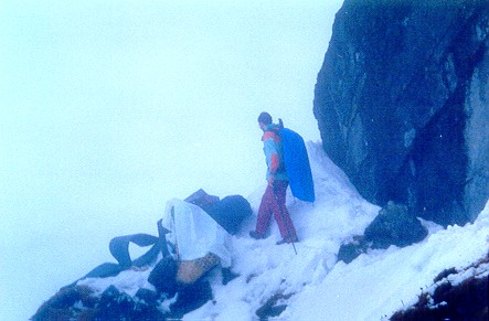 Wir müssen ein Zwischenlager im Schnee errichten.